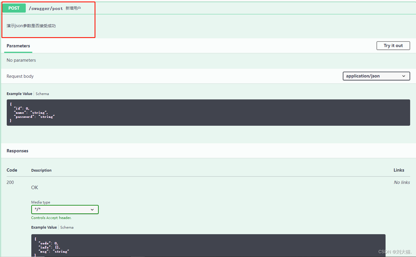 public Response postTest(@ApiParam(name = "user", value = "接收传递给后端接口的user对象参数") @RequestBody User user) {网站效果展示: