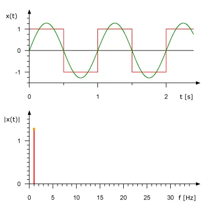 下图展示了傅里叶级数如何将一个 1 Hz 的方波在时域中分解为多个正弦波的频域组合,呈现出其各个频率成分和振幅。
