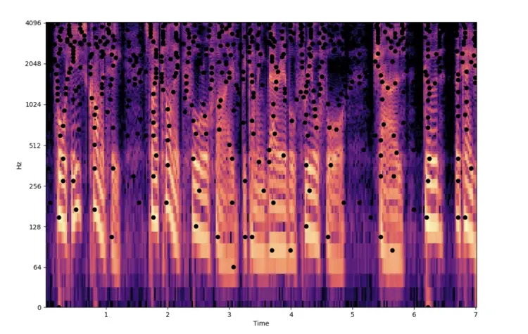 下图展示了一个语音文件在各区段被检测到的频谱图峰值示例。这些峰值点代表了音频中最显著的频率成分,也就是音频指纹的核心构成。