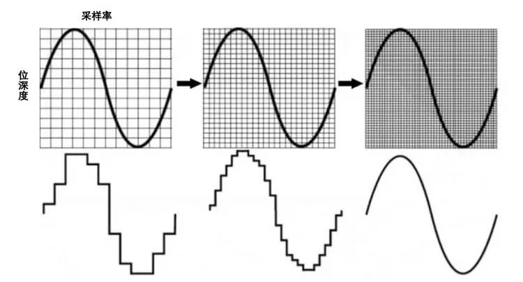 这个把连续的声音波形转化为离散数字信号过程就叫做采样。采样率决定了信号的捕捉效果。采样率越高,点越密集,原始声音被保留得越完整。下图从左到右展示了采样率由低到高的声音还原效果。