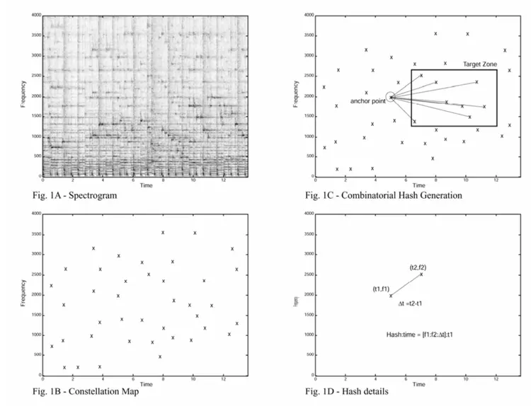我们已经看到,频谱图包含了音频中独特的频率信息,那么识曲软件是如何提取这些信息并进行比对的?