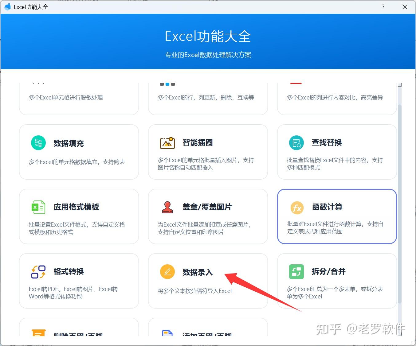 关注公众号:”老罗软件“ , 可以获取到解决方案软件下载。 这是一个专业解决excel多文件处理的方案, 找到 Excel功能大全, 然后在弹出的框里点击 ”数据录入“。