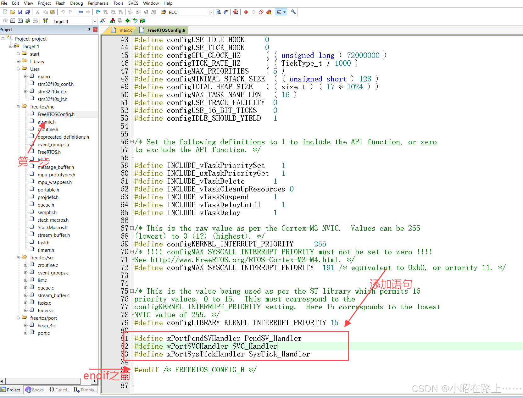 在FreeRtosConfig.h文件的最后,但是要在endif之前,添加下面的三个语句
