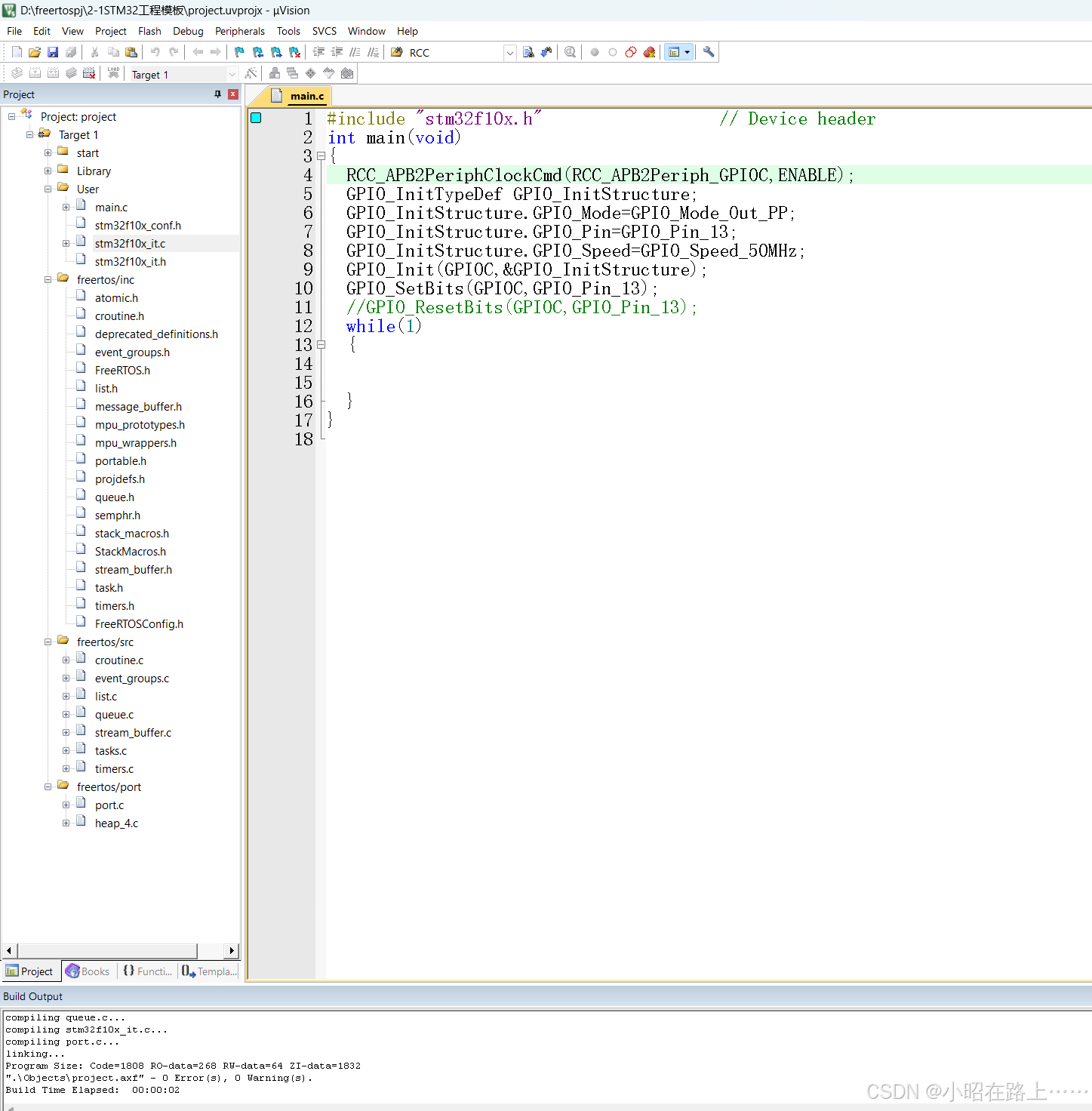 到这里,freertos操作系统就被我们成功的移植了,编译运行,0错误,0警告