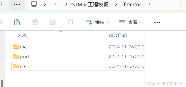 第四步:在freertos中创建三个文件,inc,src,port,用来装移植的freertos
