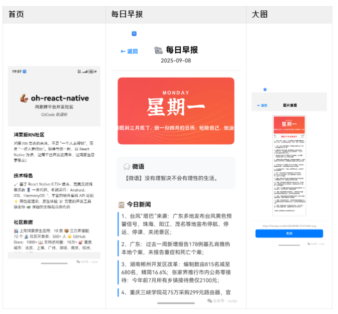 本文将基于一个实际的鸿蒙跨平台应用项目 DailyBriefHarmony,深入分析 React Native 在鸿蒙系统上的开发实践,展示如何构建一套代码支持 Android、iOS、HarmonyOS 三端运行的现代移动应用。