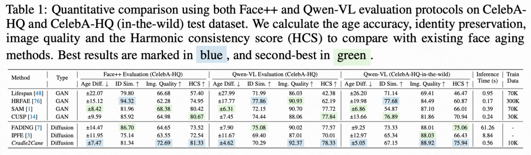 在 CelebA-HQ 和 CelebA-HQ (in-the-wild) 数据集上的实验表明,Cradle2Cane 在 Face++ 和 Qwen-VL 多模态大模型两种评估协议下,均取得了 SOTA 的成绩。 特别是在 HCS (Harmonic Consistency Score) 这一综合指标上,本文方法大幅领先于 SAM, CUSP, FADING 等基线模型 。