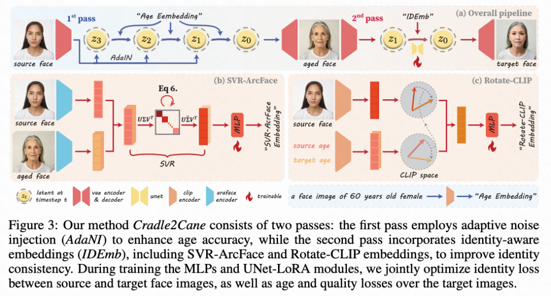 本文提出了一种基于 SDXL-Turbo 的两阶段(Two-Pass)扩散框架 —— Cradle2Cane。该方案的核心思想是“解耦”:将年龄变换和身份保持拆解为两个独立的子任务进行优化。