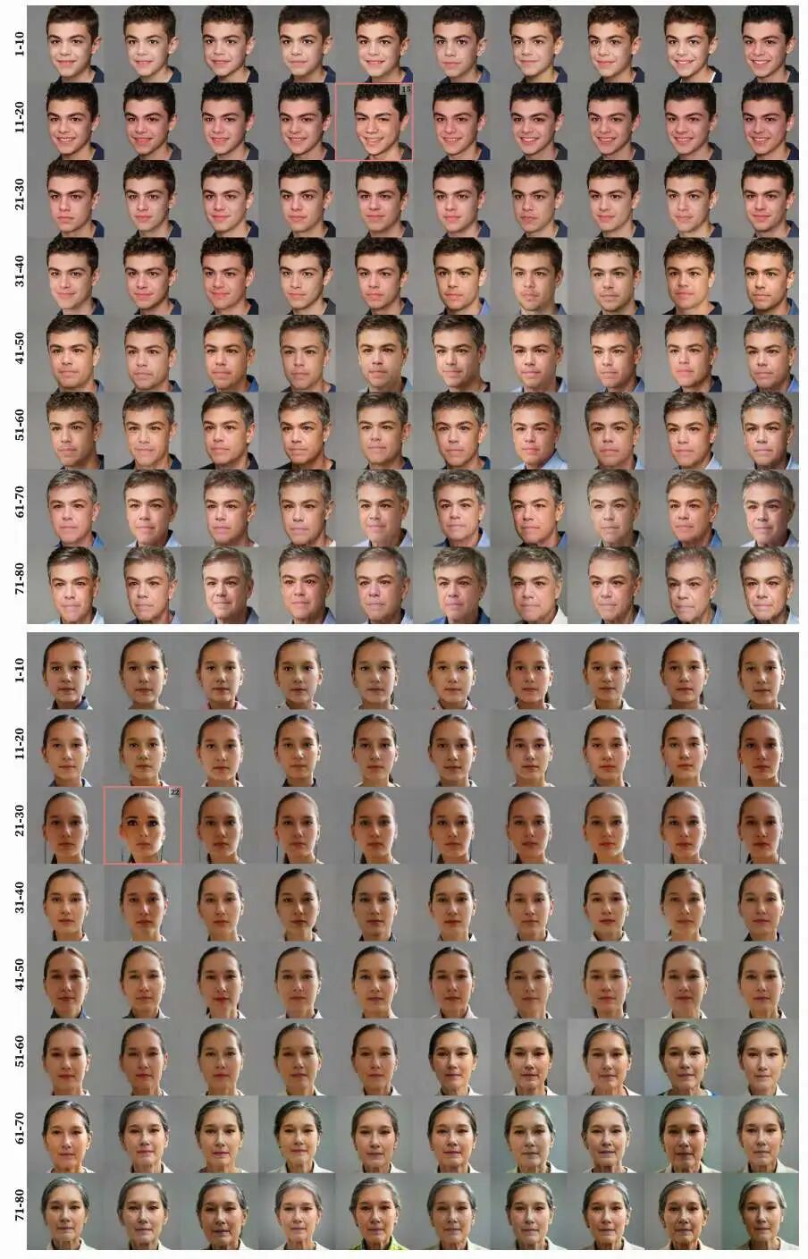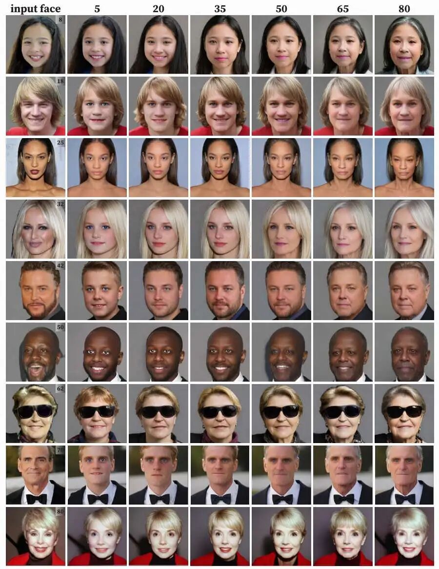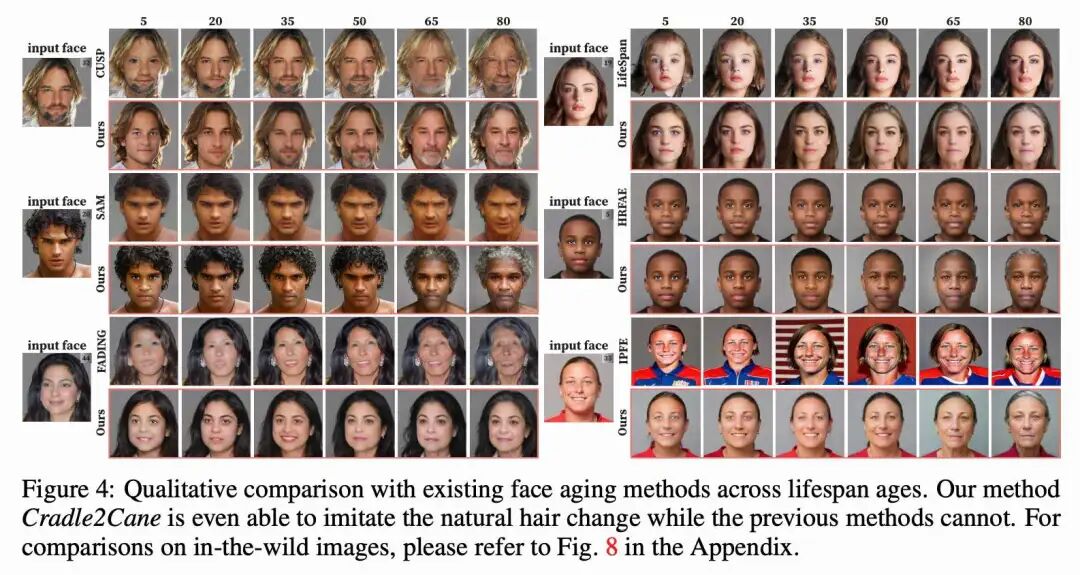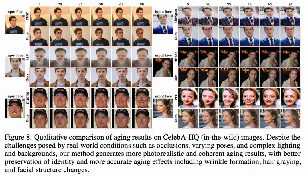 无论是皱纹的加深、皮肤的松弛,还是发色的改变(如变白),Cradle2Cane 都能生成极其自然的细节。 更重要的是,即使是处理 In-the-wild 的图片,在面对遮挡、侧脸、复杂光照时,该模型仍旧能够展现不错的效果。