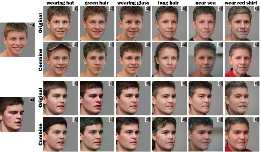 得益于两阶段编辑的灵活性,除了单独改变年龄,该方法还能同步进行人脸属性编辑。比如该方法可以无缝地应用各种属性,例如,戴眼镜、绿色的头发、戴帽子,同时持续地进行年龄增长,显著提高了生成图像的多样性和可控性。