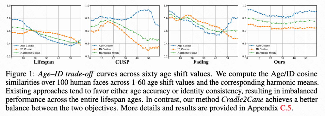 长期以来,人脸老化(Face Aging)任务都面临一个核心挑战:如何在大幅度改变年龄特征的同时,完美保留原本的身份信息? 作者将这一挑战定义为 “Age-ID Trade-off”(年龄-身份权衡)。