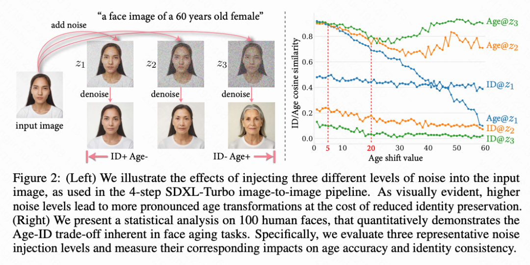 这一阶段的目标是“精准变老”。 作者发现,年龄跨度越大,所需的图像结构变化越剧烈。因此,AdaNI 机制会根据目标年龄与源年龄的差距,动态调整注入潜空间(Latent Space)的噪声水平 。