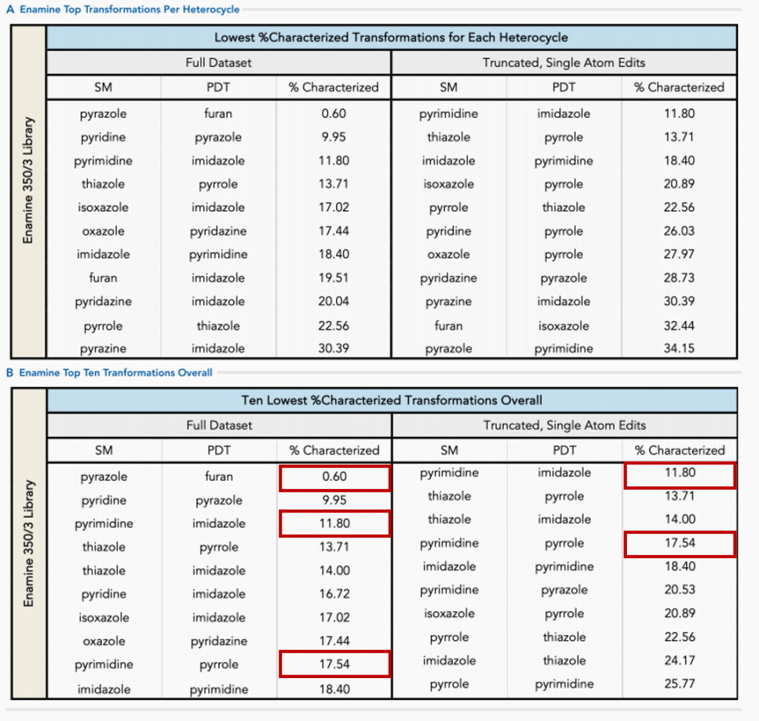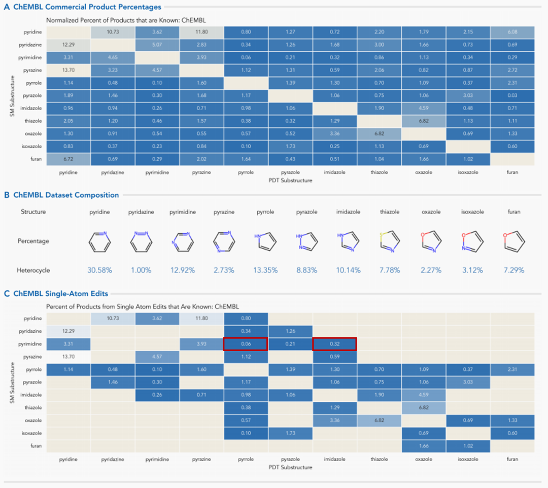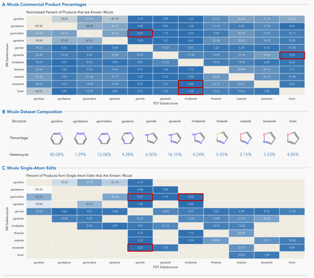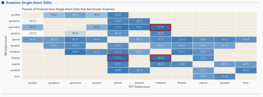 在默克(Merck)数据库中,排名前三的杂环芳基分别为哌啶(36.15%)、吡咯(9.98%)和嘧啶(9.66%)。例如,吡唑→呋喃仅得到0.02%的现有产物。同样,嘧啶→吡唑(0.60%)和咪唑→嘧啶(0.73%)的转化也会产生低百分比的现有产物。