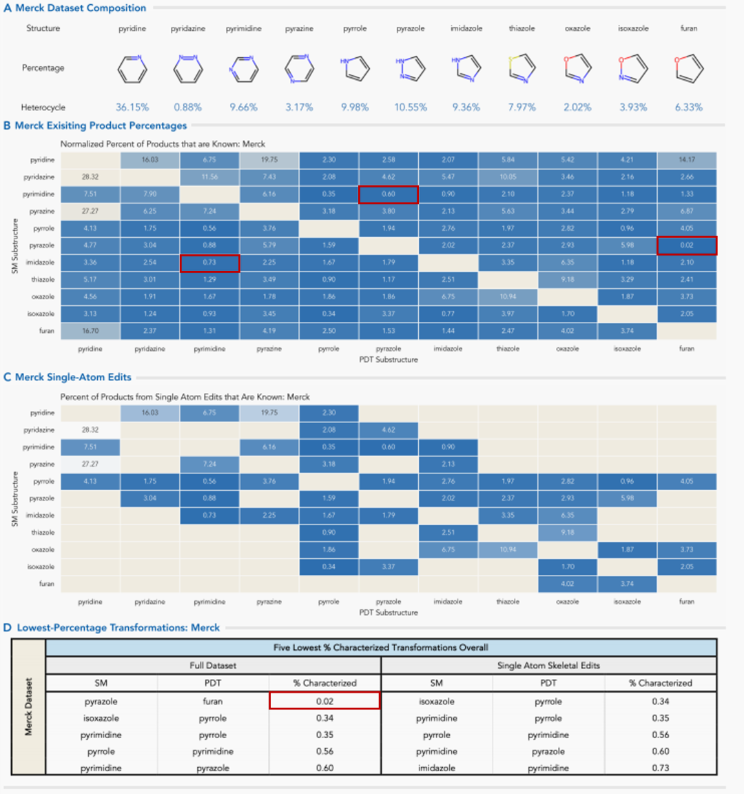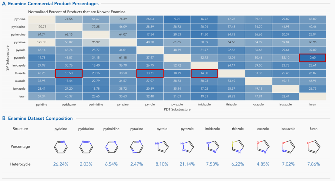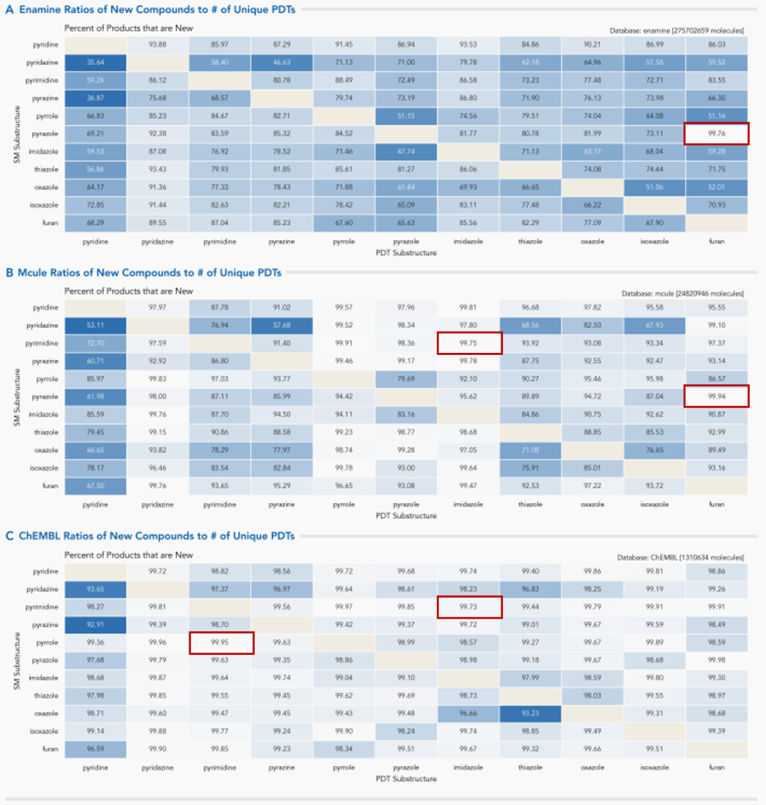 在默克(Merck)数据库中,排名前三的杂环芳基分别为哌啶(36.15%)、吡咯(9.98%)和嘧啶(9.66%)。例如,吡唑→呋喃仅得到0.02%的现有产物。同样,嘧啶→吡唑(0.60%)和咪唑→嘧啶(0.73%)的转化也会产生低百分比的现有产物。