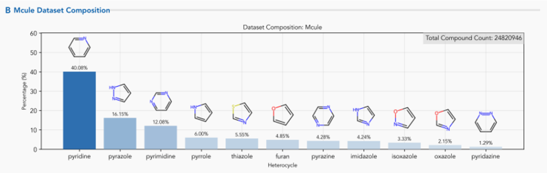 在Mcule化学数据库中,吡啶(40.08%)、吡唑(16.15%)和嘧啶(12.08%)占据前三。