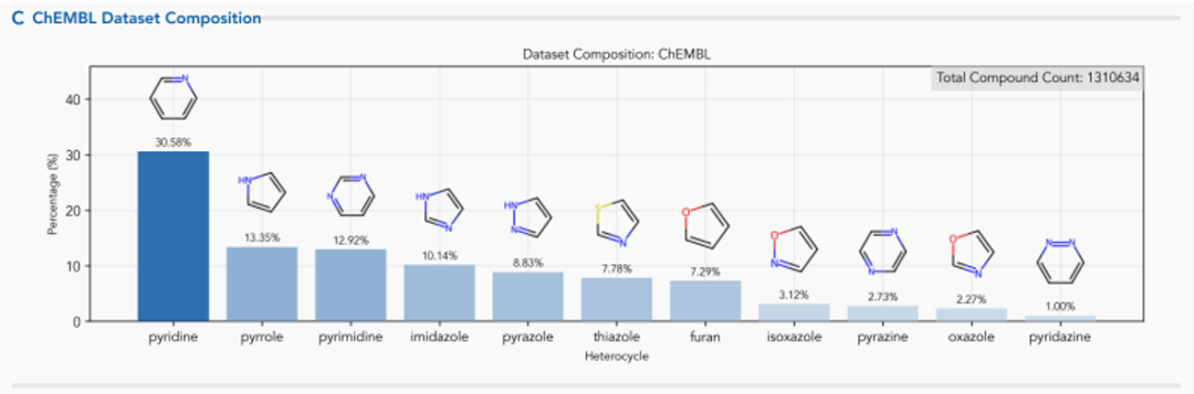 在ChEMBL化学数据库中,吡啶(30.58%)、吡咯(13.35%)和嘧啶(12.92)占据前三。