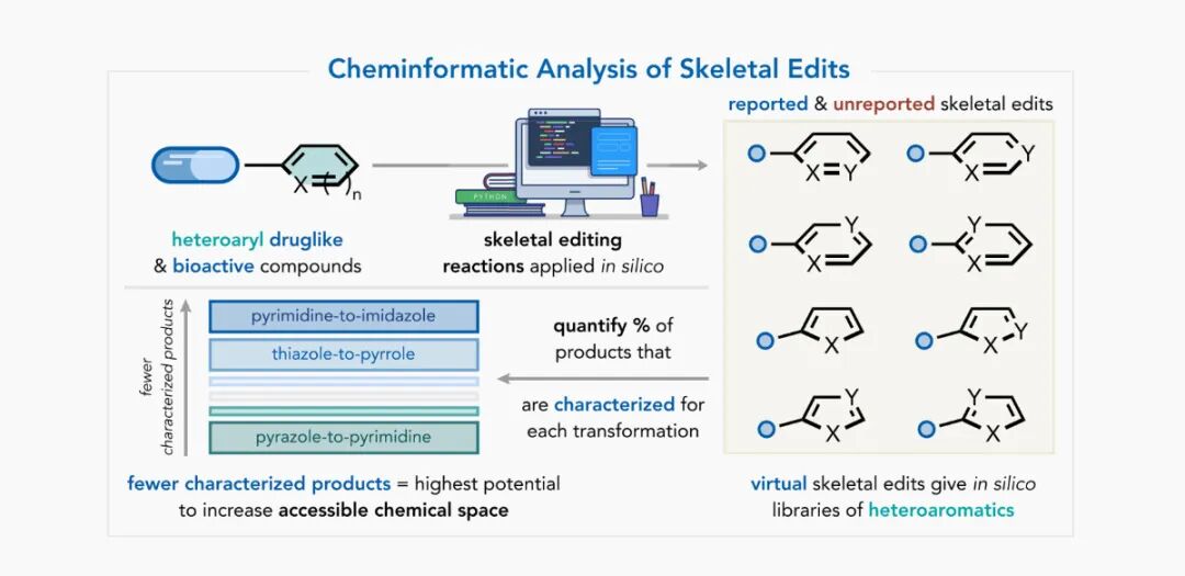 通过对杂环芳基类药物及生物活性分子进行计算机模拟反应以实现骨架编辑(如嘧啶杂环转换为咪唑杂环),构建了虚拟的骨架编辑杂环芳香化合物库,并通过量化编辑后骨架在数据库中的占比来评估其转换潜力。占比更低的杂环骨架表现出更高的转换潜力,有助于拓展可利用的化学空间。在该研究中,由嘧啶→咪唑、噻唑→吡咯的转换所对应的骨架占比均较低,表明这些转换方向可能具有更高的研究价值与应用前景。