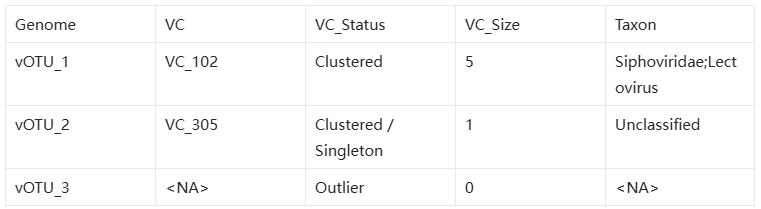 VC(Viral Cluster) : 近似于“病毒属”水平的聚类编号。如果你的vOTU和参考数据库中的病毒分到了同一个VC(如VC_102),且该VC中有已知分类的病毒(如Lectovirus),则可以推断你的vOTU属于该属。