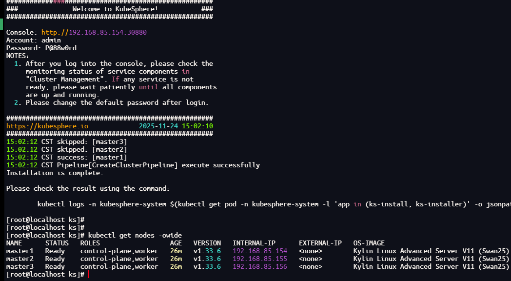 本文演示以Kylin V11刚装完系统环境下,使用几条简单的命令部署3 master的k8s 1.33.6+ks3.4.1若有其他需要可添加我微信好友sd_zdhr。
