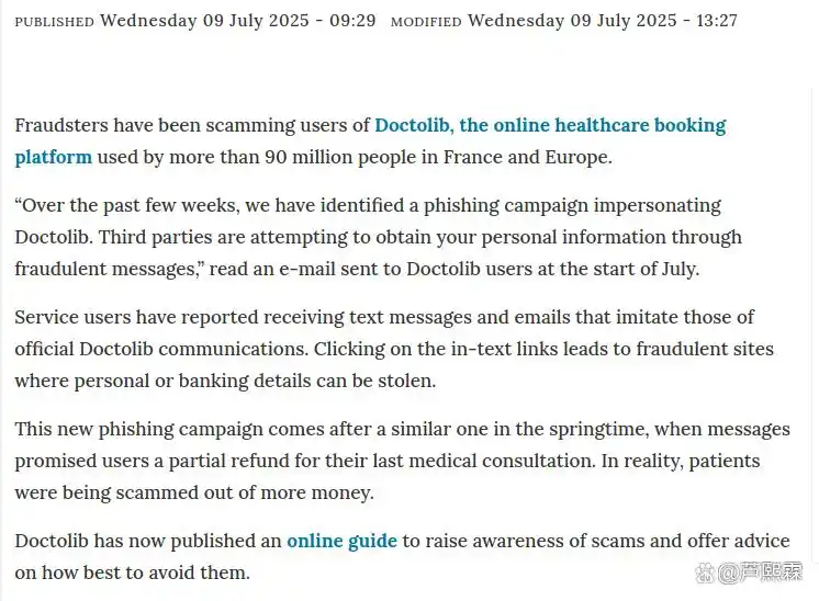 数字医疗在提升医疗服务可及性与效率的同时,也带来了新的安全挑战。作为欧洲最大的在线医疗预约平台之一,Doctolib在法国、德国、意大利等国拥有超过9000万注册用户,日均处理数十万次预约请求。其平台整合了患者身份信息、医保卡号、就诊记录乃至在线支付功能,构成高价值数据资产集合体。正因如此,Doctolib成为网络钓鱼(Phishing)攻击的高频目标。
