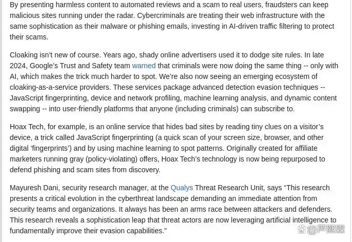 CaaS的核心功能在于实现“选择性呈现”:当访问者为自动化安全扫描器(如Google Safe Browsing爬虫、企业沙箱、威胁情报探针)时,服务器返回一个合法、无害的页面;而当访问者被判定为真实人类用户(尤其是目标企业员工)时,则加载完整的钓鱼表单或恶意脚本。这种能力并非全新概念——早期黑帽SEO曾利用User-Agent或IP地址进行简单分流。然而,现代CaaS借助JavaScript设备指纹、Canvas渲染差异、TLS指纹、鼠标移动轨迹等高维特征,结合轻量级机器学习模型,实现了远超传统规则的精准识别能力。