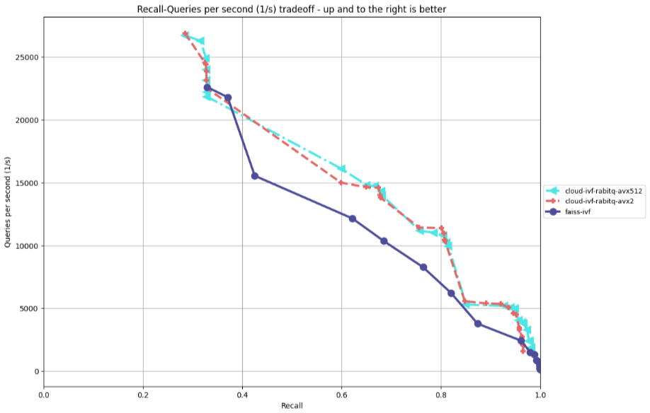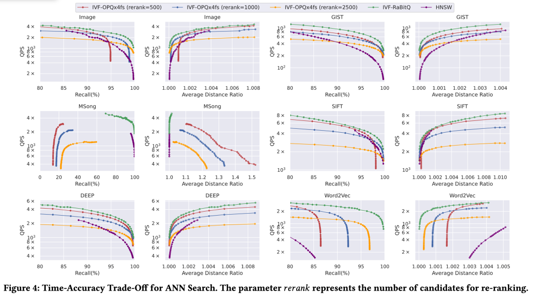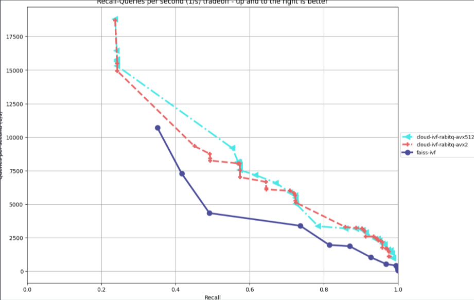 Rabit在2024年作者推出了1 bit版本,虽然具备32倍的量化比,但会有明显的召回率下降,需通过原始数据二次精排来提升召回,但这就导致了其性能的下降。在今年(2025年)作者推出了多bit版本,可以通过调整bit数来提升召回,实践证明通常5-7bit的量化就可以达到99的召回率,同时作者对查询性能上进行了大量的优化。