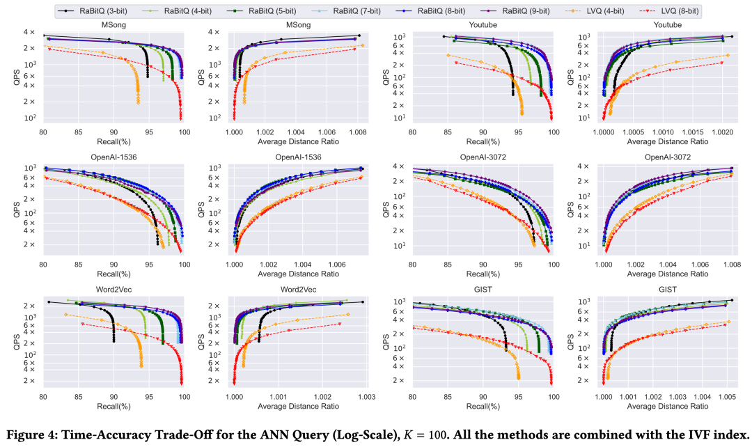 在多bits版RaBitQ的实验中,可直观地看到bit设置的越大,RaBitQ能获得的最大召回率越高,同时QPS会有所下降,但仍然比LVQ性能高。