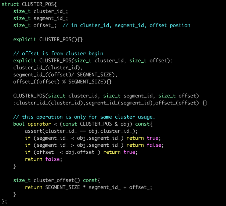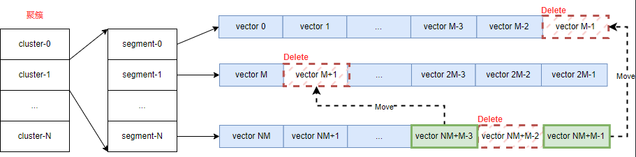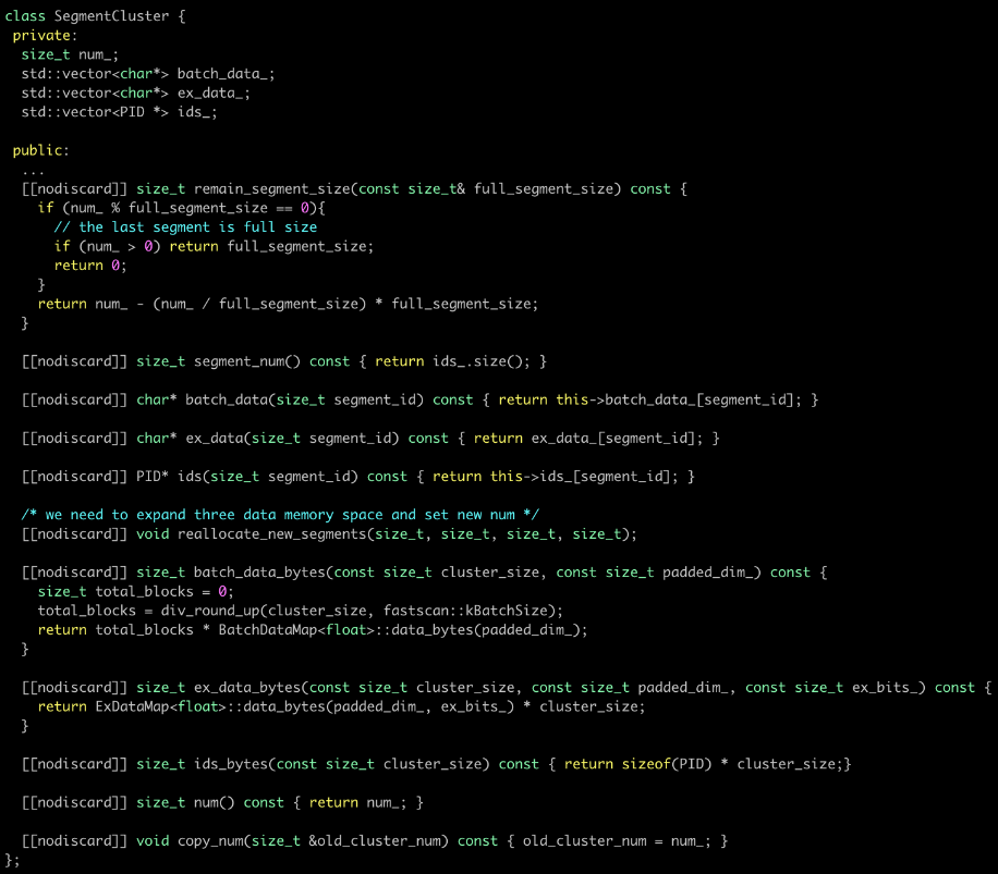 ● 无大内存分配:此时一个聚簇内部不在是一块大的数组,而是有1-N个Segment组成,每个Segment的内存size是可控的,且按照cache line对齐,避免False Sharing。因此后续新增数据时,只需要追加新的Segment数据块,从而避免数据拷贝。在代码层面VDB使用SegmentCluster来实现每个聚簇数据的存储: