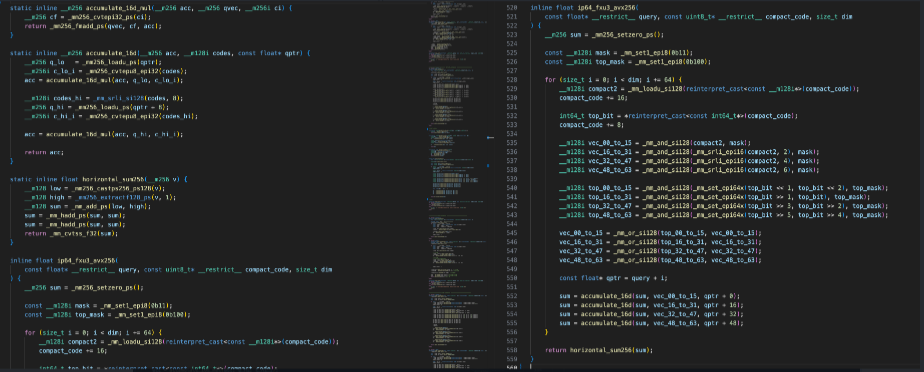 RabitQ算法相比其他量化算法,存储空间小的一大关键在于量化后的向量各个元素通过高位打包,低位拼接的形式存储量化后的向量;召回率高的另一关键在于量化向量解压缩后,配合预先计算好的误差参数得到相对无损的距离;计算速度快在于硬件加速,引入更多向量寄存器的avx2/avx512指令集的SIMD计算架构比较适合当前的任务。