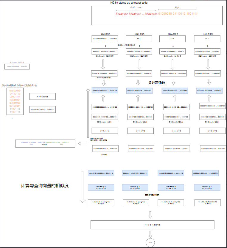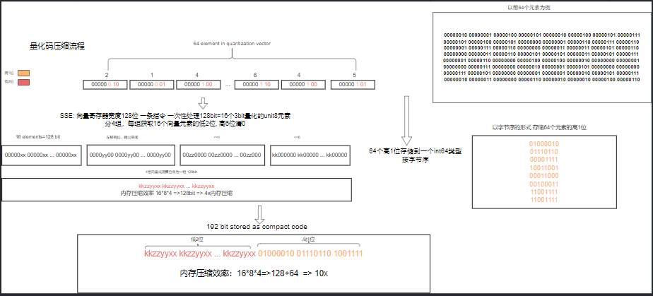 压缩和解压缩是适配的。压缩阶段将量化后的向量的高位元素打包进一个为一个最近整型,低位不断拼接到多个8位整型数组中。最终合并到一起。期间大部分为移位操作,且性能约束低,直接使用SSE指令比较通用;解压缩阶段avx指令贯穿其中。解压缩阶段目的是将向量恢复压缩前的状态,此时主要涉及到查询场景,性能要求更高。