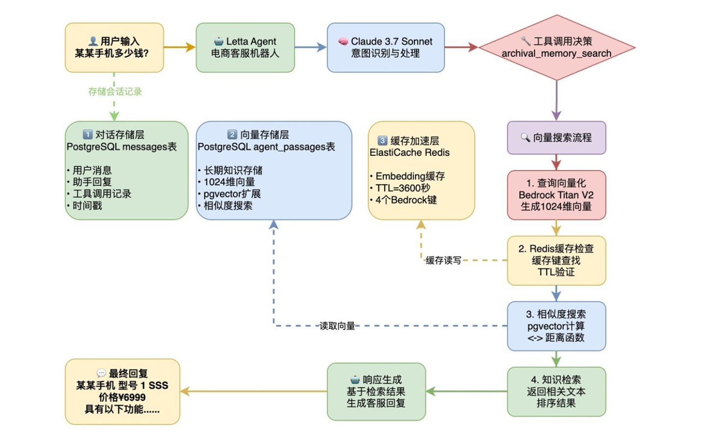 Letta可无缝对接亚马逊云科技服务栈,以下是一个通过 Letta 框架搭建的电商客服机器人问答流程示例: