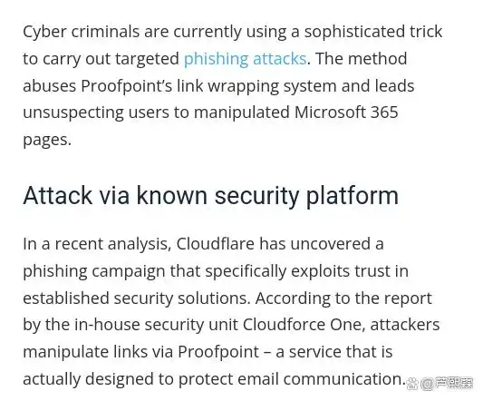 然而,安全机制本身亦可能成为攻击面。2025年7月,Cloudflare安全研究团队披露了一起利用Proofpoint链接封装机制实施钓鱼攻击的案例。攻击者并非绕过该机制,而是主动将其纳入攻击链,使恶意链接在形式上呈现为“经Proofpoint安全扫描”的可信资源。这种“以守为攻”的策略,颠覆了传统基于来源可信度的判断逻辑,对终端用户与自动化检测系统均构成严峻挑战。