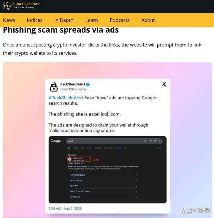 2025年8月7日,区块链安全公司PeckShield披露一起针对Aave投资者的大规模钓鱼事件。攻击者在谷歌广告平台(Google Ads)购买“aave invest”“aave staking”等高热度关键词,将广告指向精心仿制的Aave前端界面。用户点击后被诱导连接MetaMask等钱包,随后恶意网站请求“无限授权”(Infinite Approval)以转移代币。由于广告出现在谷歌搜索结果顶部且带有“广告”标识,许多用户误认为其为官方服务,导致资产被盗。