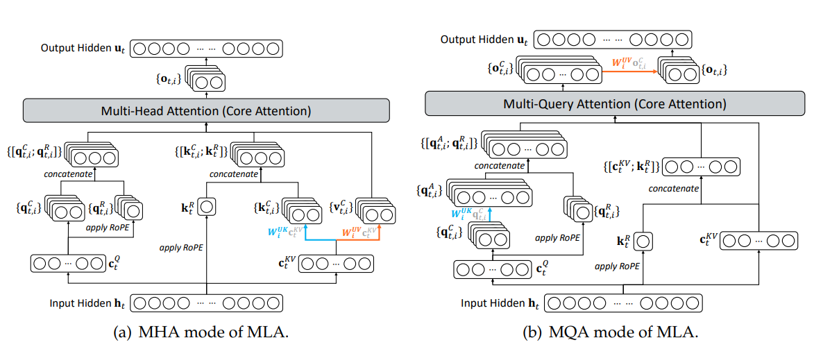 一个关键的设计决策是DSA直接基于MLA的MQA模式实现。技术报告明确解释了原因,在kernel级别,为了实现计算效率的最大化,每个KV entry必须能被多个query重复利用。MQA的结构天然符合这种硬件友好的访存模式。