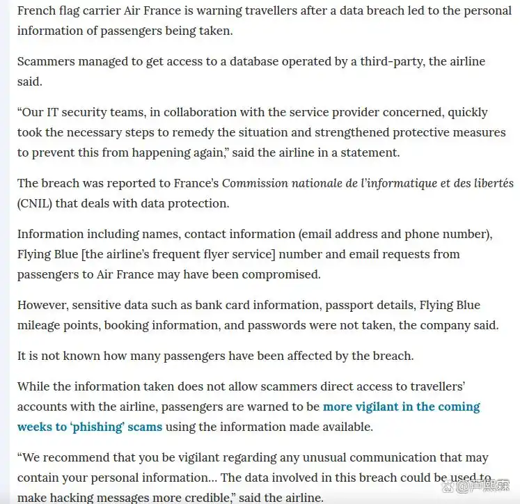 2025年8月7日,法国航空公司Air France正式通报一起由第三方服务提供商数据库遭入侵引发的数据泄露事件。据公司公告,攻击者获取了部分乘客的姓名、电子邮箱地址、电话号码、Flying Blue常旅客编号以及历史客服通信内容。值得注意的是,Air France明确指出银行账户信息、护照数据、里程余额及账户密码等核心敏感信息未被泄露。然而,这一声明并未消除安全社区的担忧:泄露的“非敏感”数据恰恰构成了实施高针对性钓鱼攻击(spear phishing)的理想素材。
