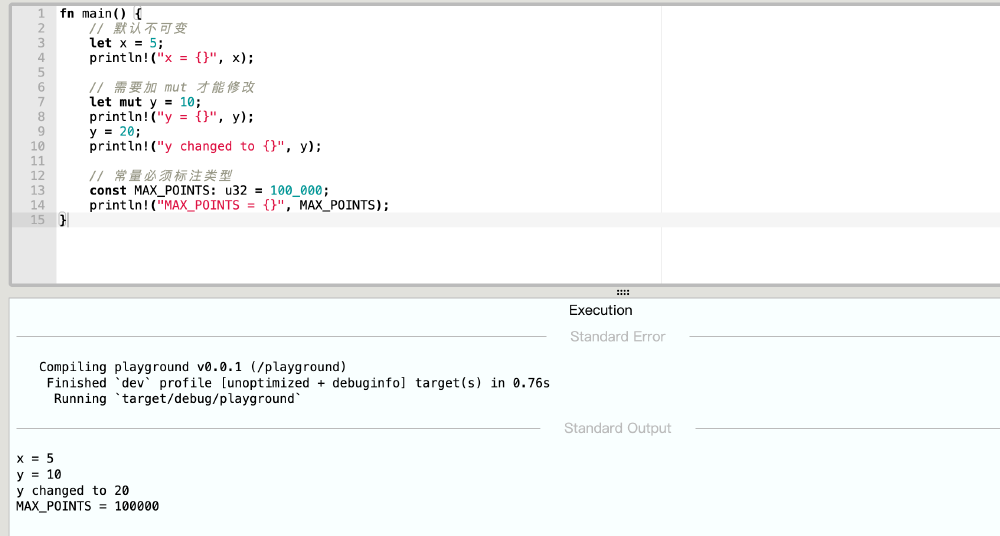 fn main() { // 默认不可变 let x = 5; println!("x = {}", x); // 需要加 mut 才能修改 let mut y = 10; println!("y = {}", y); y = 20; println!("y changed to {}", y); // 常量必须标注类型 const MAX_POINTS: u32 = 100_000; println!("MAX_POINTS = {}", MAX_POINTS); }