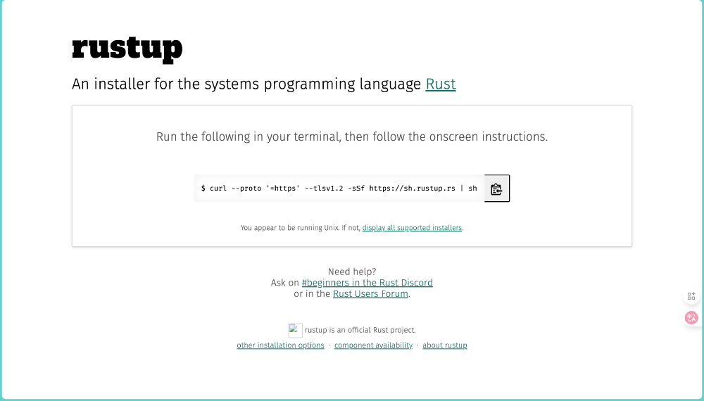 curl --proto '=https' --tlsv1.2 -sSf https://sh.rustup.rs | sh