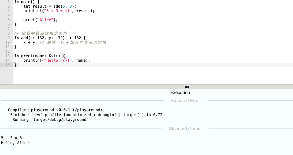 fn main() { let result = add(5, 3); println!("5 + 3 = {}", result); greet("Alice"); } // 函数参数必须指定类型 fn add(x: i32, y: i32) -> i32 { x + y // 最后一行不加分号表示返回值 } fn greet(name: &str) { println!("Hello, {}!", name); }