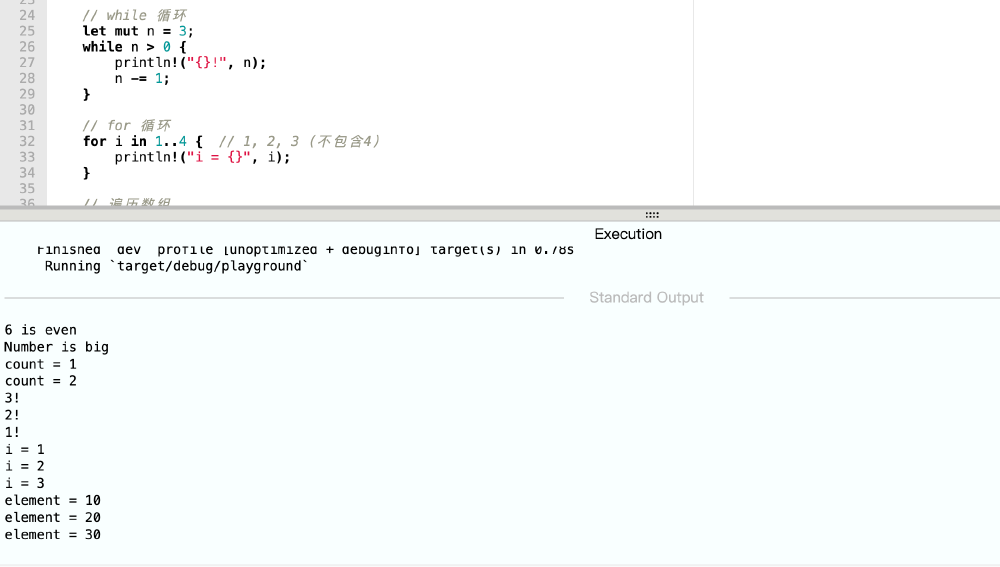 fn main() { // if 表达式 let number = 6; if number % 2 == 0 { println!("{} is even", number); } else { println!("{} is odd", number); } // if 可以作为表达式 let result = if number > 5 { "big" } else { "small" }; println!("Number is {}", result); // loop 循环 let mut count = 0; loop { count += 1; if count == 3 { break; } println!("count = {}", count); } // while 循环 let mut n = 3; while n > 0 { println!("{}!", n); n -= 1; } // for 循环 for i in 1..4 { // 1, 2, 3(不包含4) println!("i = {}", i); } // 遍历数组 let arr = [10, 20, 30]; for element in arr.iter() { println!("element = {}", element); } }