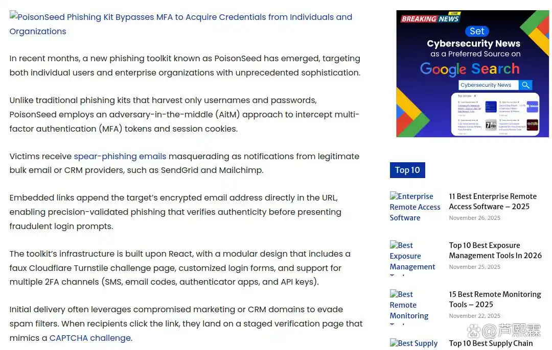 2025年8月,安全研究机构NVISO Labs披露了一款名为“PoisonSeed”的新型PhaaS套件。该套件不仅具备传统PhaaS的基本功能,更在MFA绕过、反检测规避和自动化响应方面展现出前所未有的成熟度。PoisonSeed通过精密的前端验证机制确保仅向真实目标展示钓鱼页面,并利用React框架构建高度仿真的用户界面,无缝集成对短信、邮箱、认证器应用及API密钥等多种MFA方式的支持。攻击成功后,其后台能自动导出联系人列表、劫持邮件基础设施,并通过即时通讯工具通知攻击者,甚至启动脚本对受害者内网资源进行初步探测。