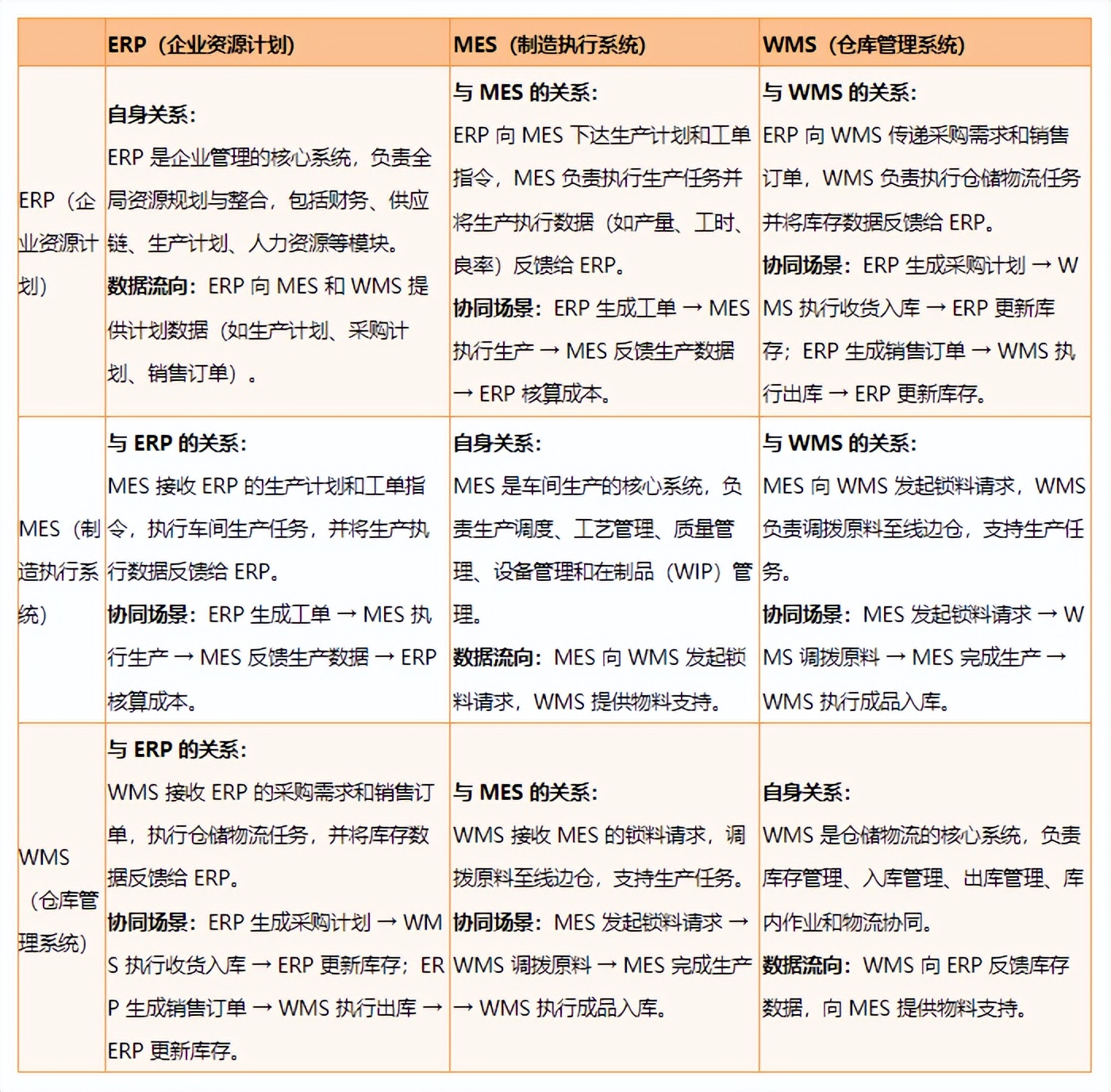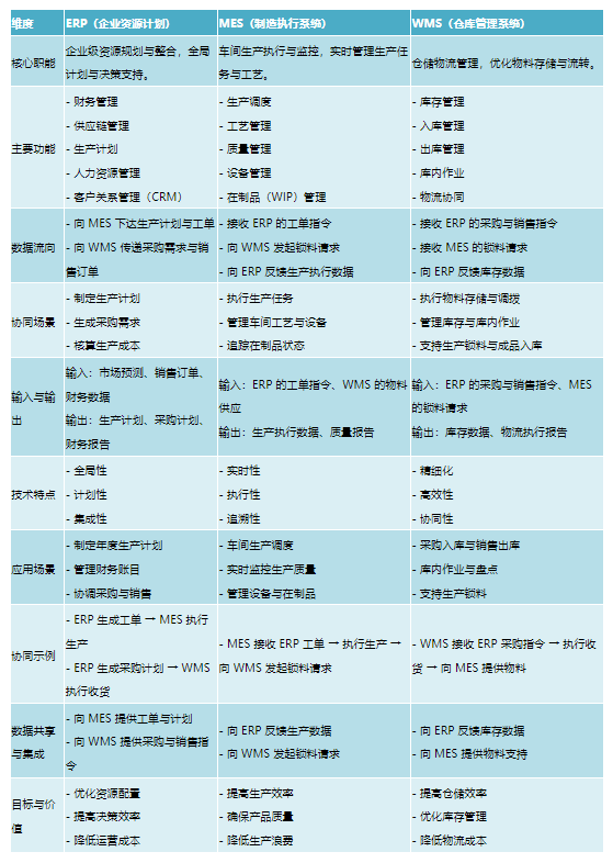ERP负责全局计划,MES负责生产执行,WMS负责物料支持。