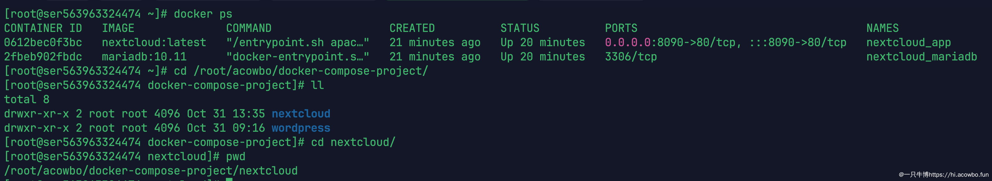 从截图可以看到,项目目录创建成功。同时也能看到之前的 wordpress 目录,说明我们的项目结构很规范。用 docker ps 查看了一下,之前部署的 WordPress 容器还在跑着,这次部署 Nextcloud 不会影响它。