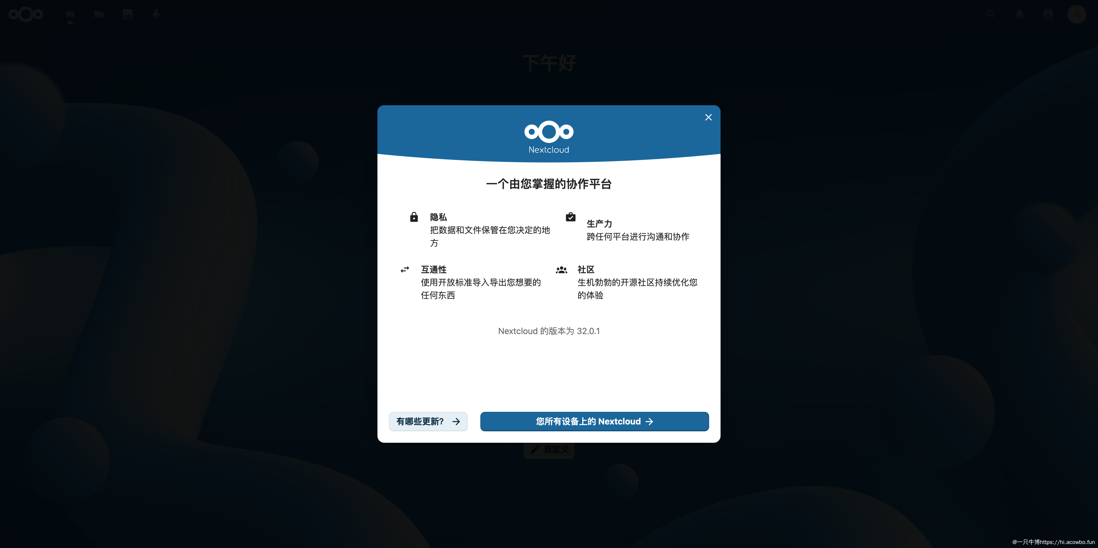 Nextcloud 是一个开源的私有云存储解决方案,可以理解为自己搭建的"百度网盘"。主要功能有: