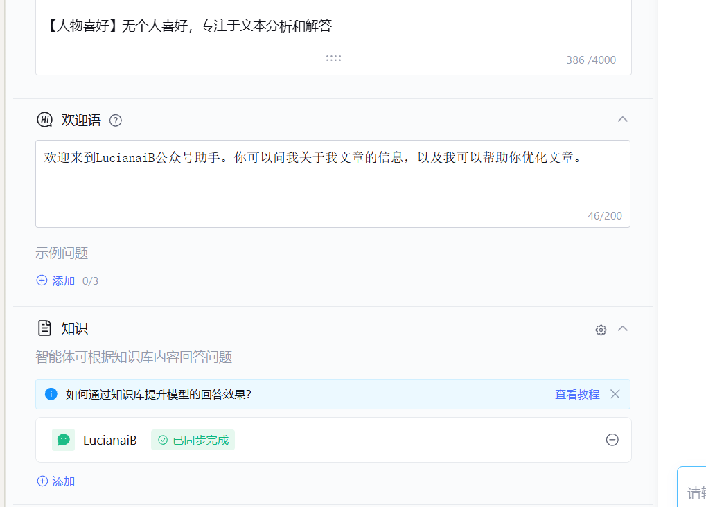 这里不用管知识库,因为智能体后已经自动导入1年内公众号文章。