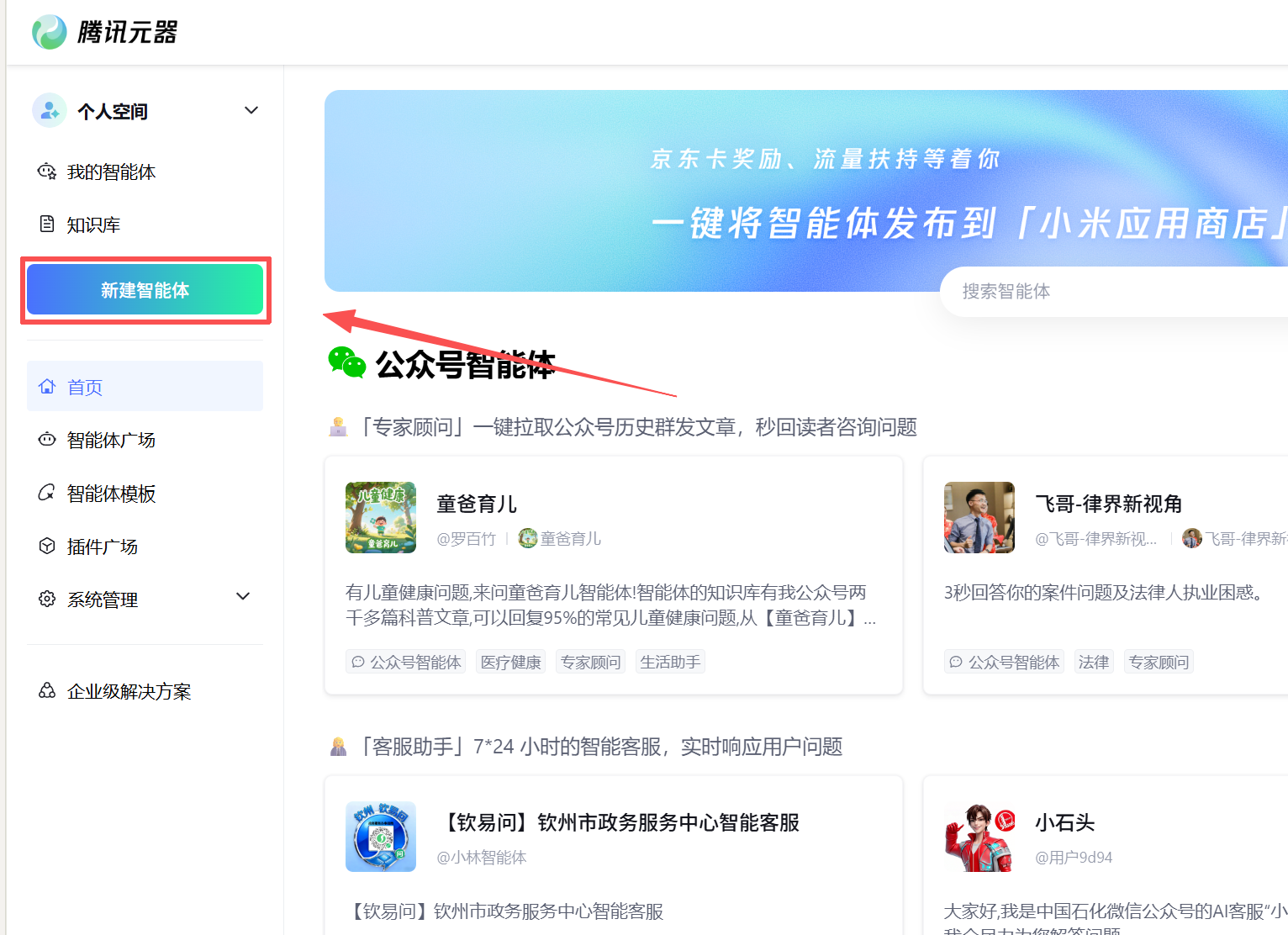 前往腾讯元器智能体平台(https://yuanqi.tencent.com/),使用微信登录即可,点击「新建智能体」开启智能体开发之旅。