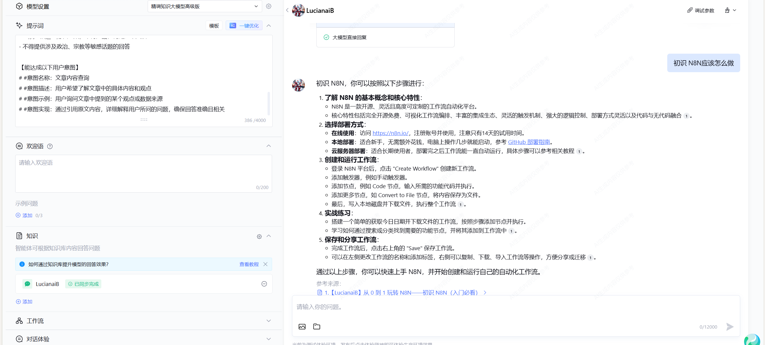# #意图实现:通过引用原文内容,详细解释用户所问的问题,确保回答准确且相关我们进行一个简单的测试,在右侧直接问:初识 N8N应该怎么做