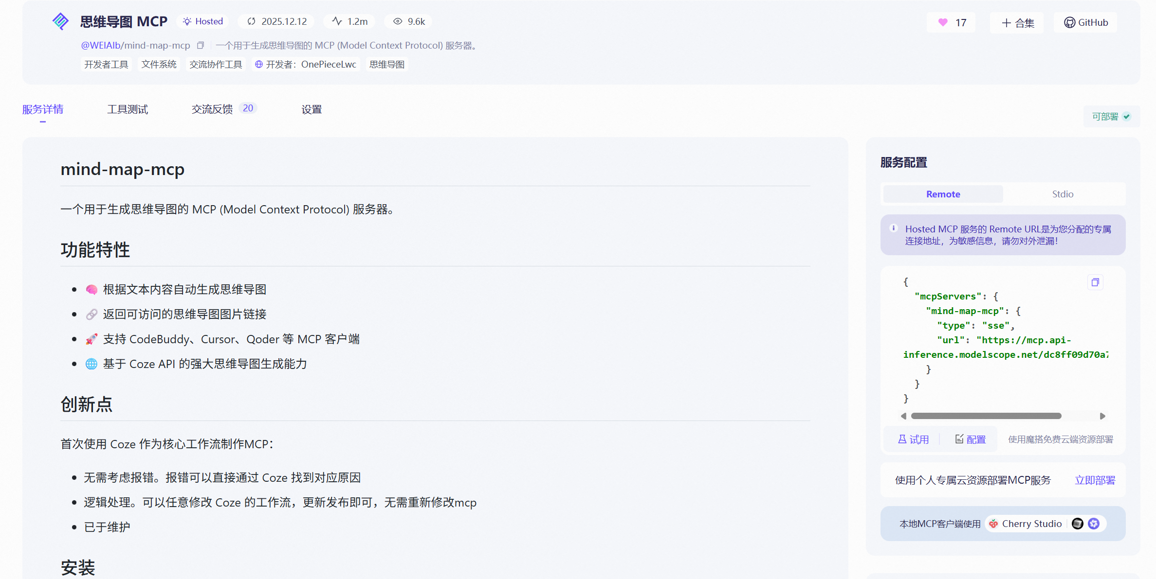 我自研的 MCP 服务部署在魔搭(ModelScope)MCP 广场,支持通过 SSE 协议实时生成结构化思维导图,为智能体提供逻辑梳理与内容可视化能力,已经累计托管服务调用次数1.1m次。也就是被调用10万次加。