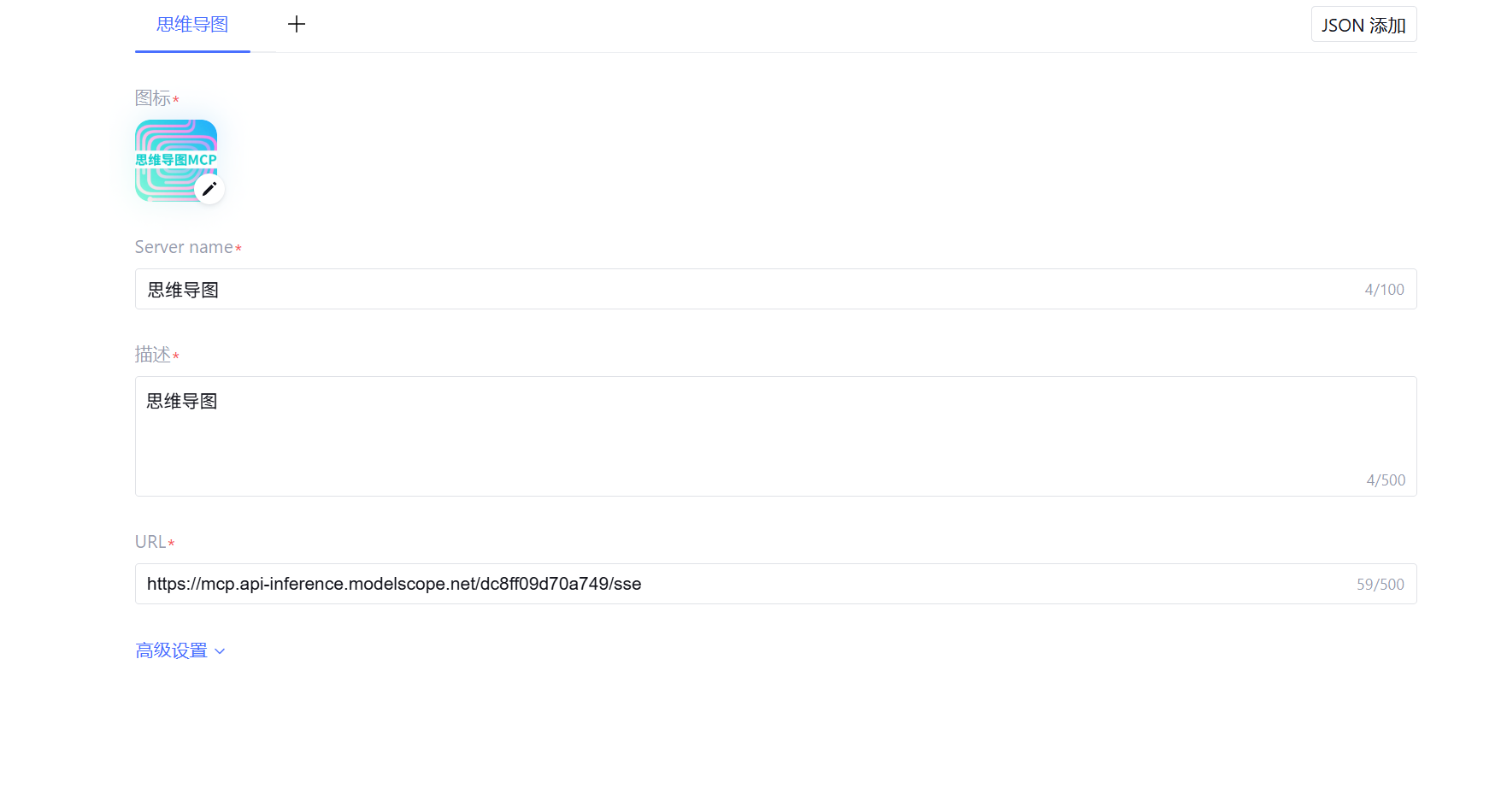由于我的mcp部署在魔塔mcp广场,所以打开魔塔中我的mcp,https://modelscope.cn/mcp/servers/WEIAIb/mind-map-mcp,在右侧配置一个就可以得到一个sse的url。