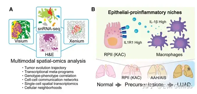 肺癌腺癌(LUAD)的癌前细胞如何与其周围微环境协同作用驱动肿瘤进展,这一机制尚不明确。通过多模态空间组学技术,全面解析了癌前肺组织与LUAD组织,揭示了在癌症进展过程中共同演化的肺泡祖细胞与促炎微环境。